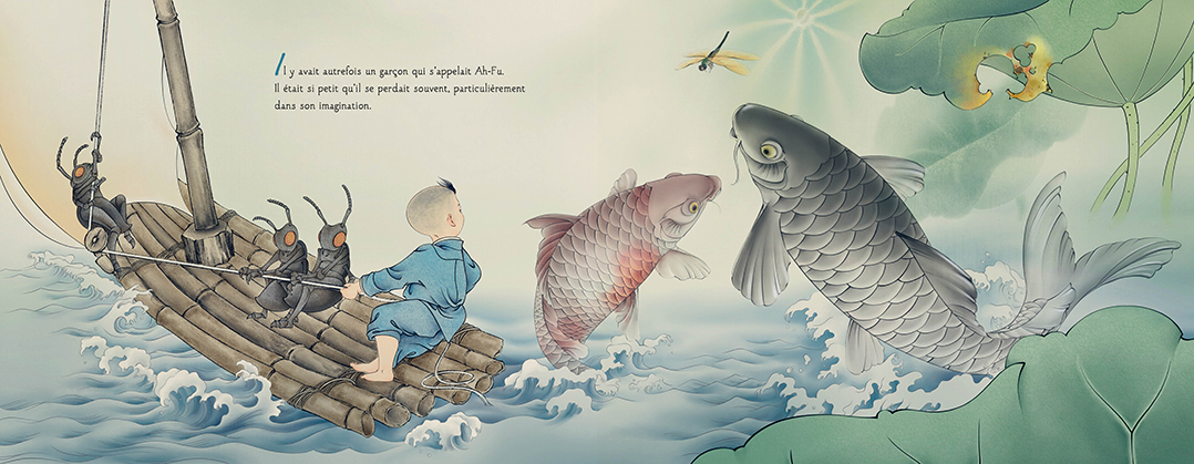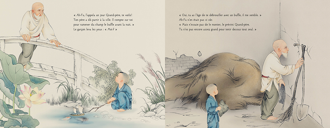 Aujourd’hui, Ah-Fu se voit confier une lourde responsabilité : aller chercher le buffle au champ et le ramener avant la nuit. Le garçon se sent trop petit pour accomplir cette mission mais il se donne du courage en se répétant les conseils qu’on lui a prodigués sur le chemin : ne monte pas sur son dos, ne cherche pas à le guider. En voyant l’énorme animal, Ah-Fu est pris de panique. Mais à sa grande surprise, le buffle est soulagé de le voir : « Te voilà ! Je t’ai attendu, je déteste le noir et il commence à faire sombre… » Ah-Fu n’en croit pas ses oreilles. Jamais il n’aurait pu imaginer qu’une bête aussi grosse puisse craindre quelque chose ! Les rôles s’inversent alors : c’est lui, Ah-Fu, qui va rassurer le buffle. En se montrant doux et bienveillant, il va l’escorter jusqu’à la maison.