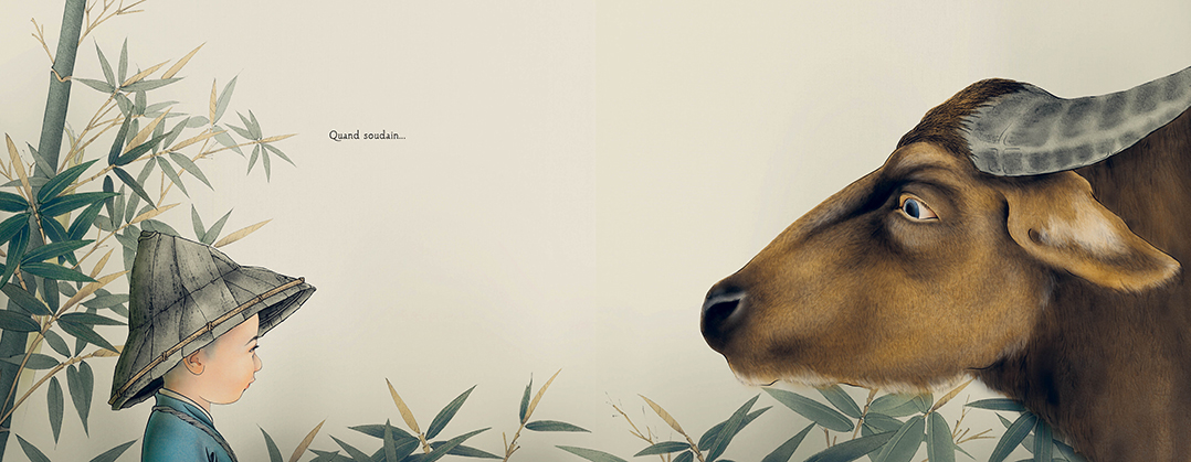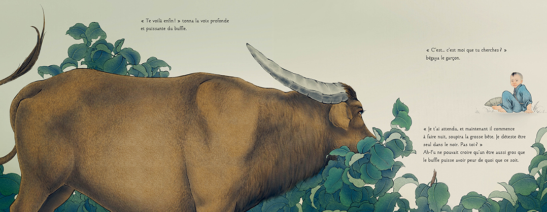 Aujourd’hui, Ah-Fu se voit confier une lourde responsabilité : aller chercher le buffle au champ et le ramener avant la nuit. Le garçon se sent trop petit pour accomplir cette mission mais il se donne du courage en se répétant les conseils qu’on lui a prodigués sur le chemin : ne monte pas sur son dos, ne cherche pas à le guider. En voyant l’énorme animal, Ah-Fu est pris de panique. Mais à sa grande surprise, le buffle est soulagé de le voir : « Te voilà ! Je t’ai attendu, je déteste le noir et il commence à faire sombre… » Ah-Fu n’en croit pas ses oreilles. Jamais il n’aurait pu imaginer qu’une bête aussi grosse puisse craindre quelque chose ! Les rôles s’inversent alors : c’est lui, Ah-Fu, qui va rassurer le buffle. En se montrant doux et bienveillant, il va l’escorter jusqu’à la maison.